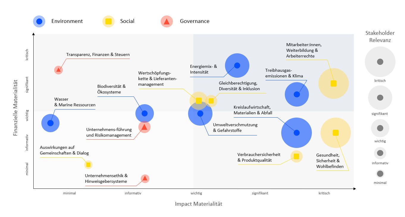Das Ergebnis wird als Wesentlichkeitsmatrix dargestellt und dient als Grundlage, um die wichtigsten Handlungsfelder zu identifizieren.